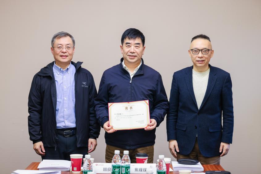 图为焦捷(右)、顾良飞(左)为焦瑾璞(中)颁发聘书